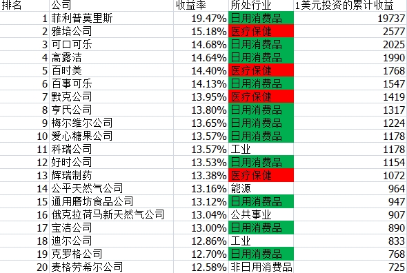 很顯著可以看出,通過50多年,最掙錢的職業(yè)十分會(huì)集,主要是日用消費(fèi)品職業(yè)和醫(yī)療保健職業(yè),壟斷了長(zhǎng)時(shí)刻牛股的絕大多數(shù)。排行首位的是出產(chǎn)聞名卷煙品牌萬(wàn)寶路的菲利普莫里斯公司,假如在1957年出資一萬(wàn)元,到今天會(huì)變?yōu)?.97億元!適當(dāng)?shù)捏@人。別的的長(zhǎng)時(shí)刻大牛股也是咱們耳熟能詳?shù)钠綍r(shí)消費(fèi)品和醫(yī)藥生物公司。