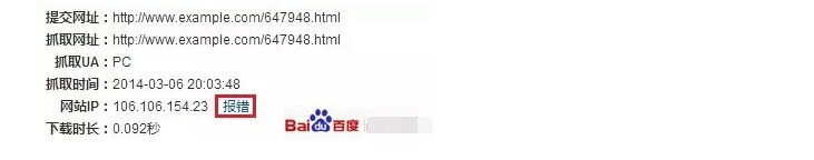 抓取診斷工具會檢查站點與百度的連接是否暢通,若站長發(fā)現IP信息還是老舊的,可以通過“報錯”通知百度搜索引擎更新IP,如下圖所示: